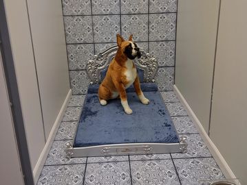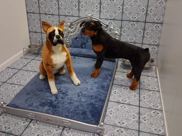 Royal Suites are for respectful dogs only (potty trained and non-destructive.) Royal suites feature upgraded amenities, including decorative tile, specialty bed and food bowls, and personal television and include our Royalty Enrichment Package.