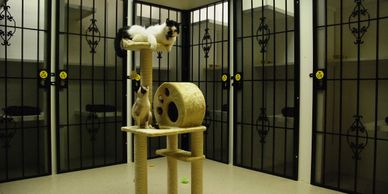 Our cat boarding features 4-story townhouses that are 8 feet high and can accommodate up to 3 same-family cats. Cats are entertained 24/7 with television programming to remind them of home and muffle any dog noises. Temperament permitting, cats are let out one family at a time in the cat room play area to stretch or relax or to play with the toys and cat trees provided. They may even "say cheese" for the webcam!